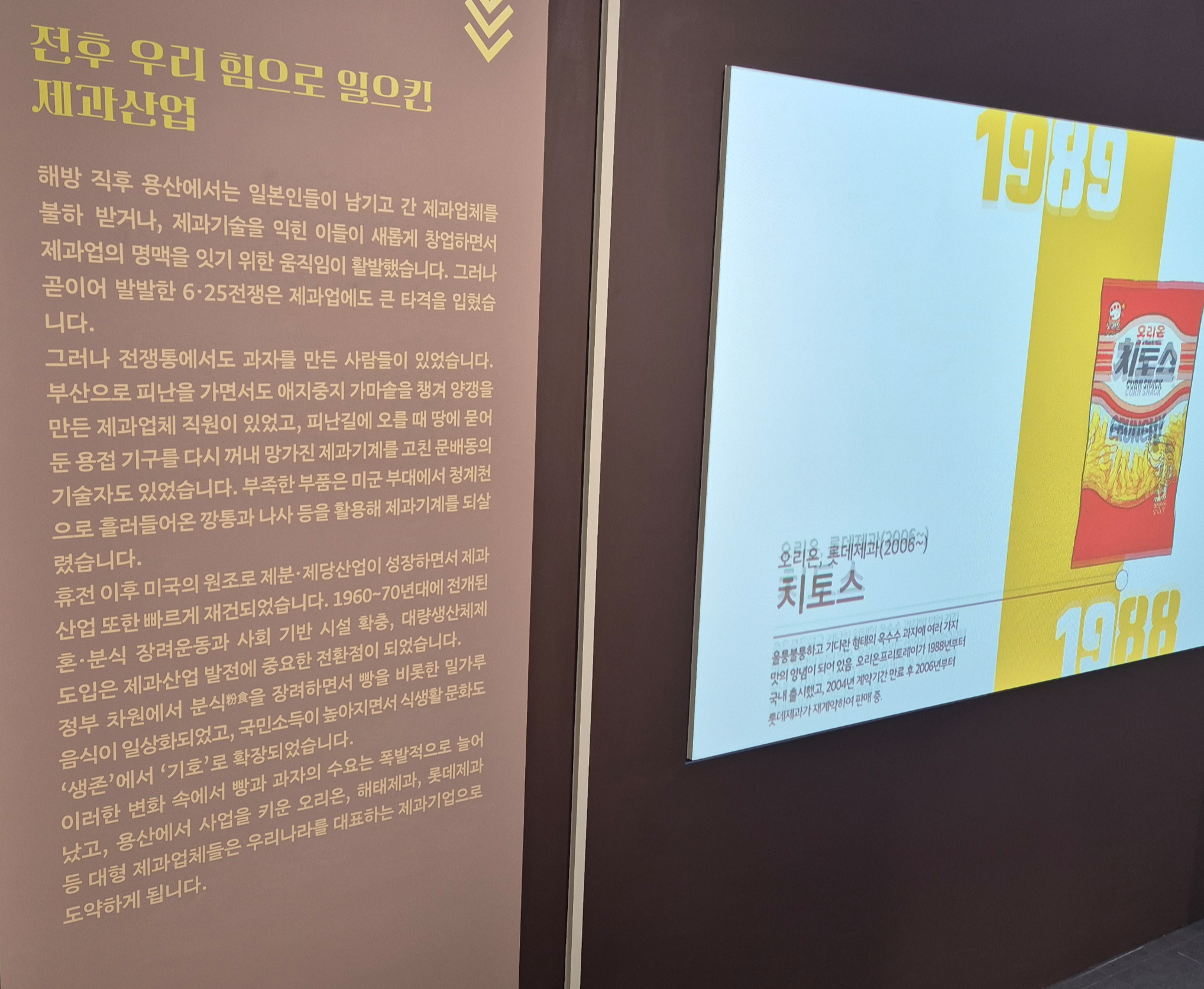 일제강점기 용산 전 지역에 있던 과자공장의 지도나, 혼분식 장려운동 홍보지같은 역사적 자료와, 지금까지 만들어지고 있는 근본있는 과자들의 출시년월, 각 브랜드에서 만든 과거 제품과 신제품 패키지, 현재 용산에 위치한 과자점이나 디저트 가게등을 소개하는 등 전시의 현시대성까지 보여줍니다.