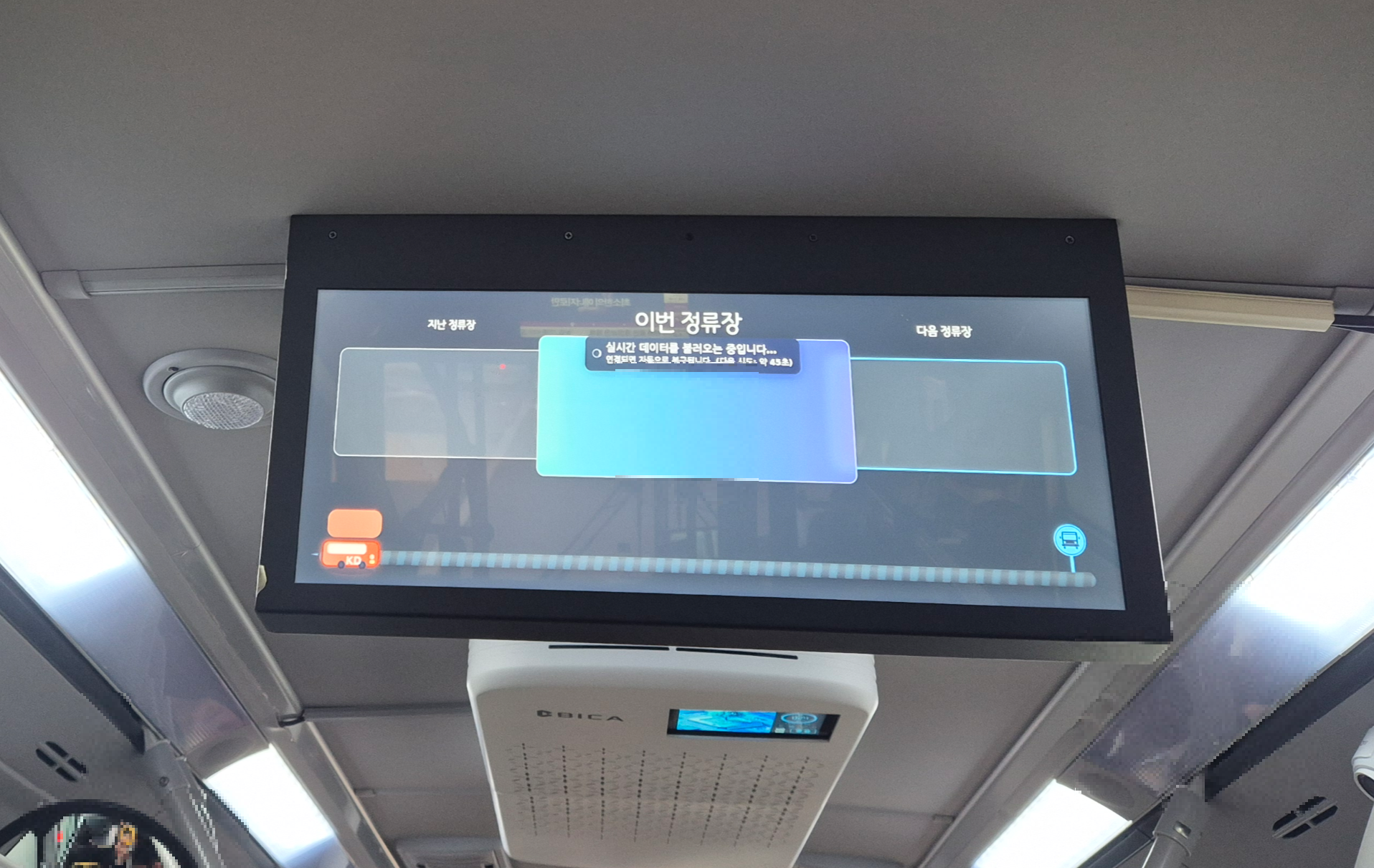 버스의 정류장 안내는 많이 있었죠. 좌석 위에 붙은 노선도나, 버스 승차문 근처의 안내화면, 버스 내 홍보 동영상 한 쪽에 나오는 전광판까지 다양하게 있죠. 최근엔 홍보영상을 재생하다가도 중간에 노선을 알려줘서 편리하죠.