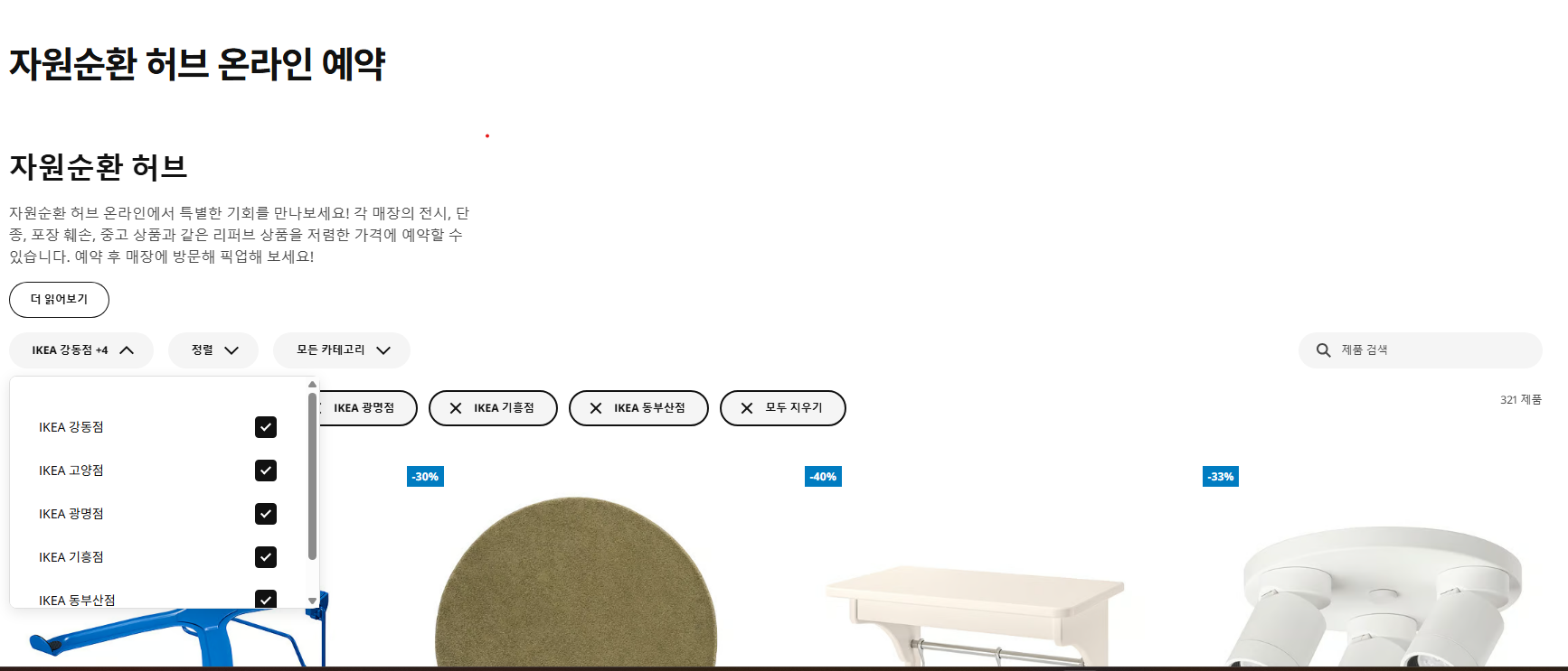 그런 제품들은 자원순환 허브 온라인 https://www.ikea.com/kr/ko/circular/second-hand 를 통해 예약, 매장에 방문해 픽업하실 수 있습니다.